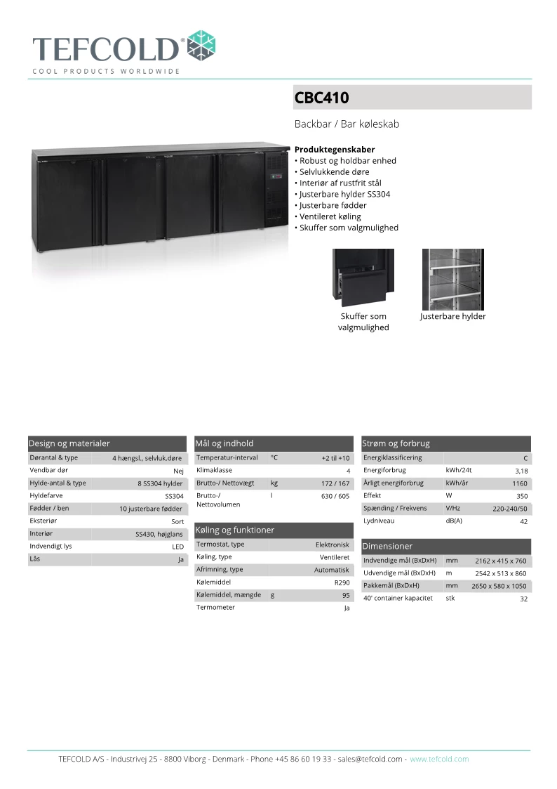 LED-lys indvendigt, Temperaturinterval: 2 til 10°C, ventileret køl.