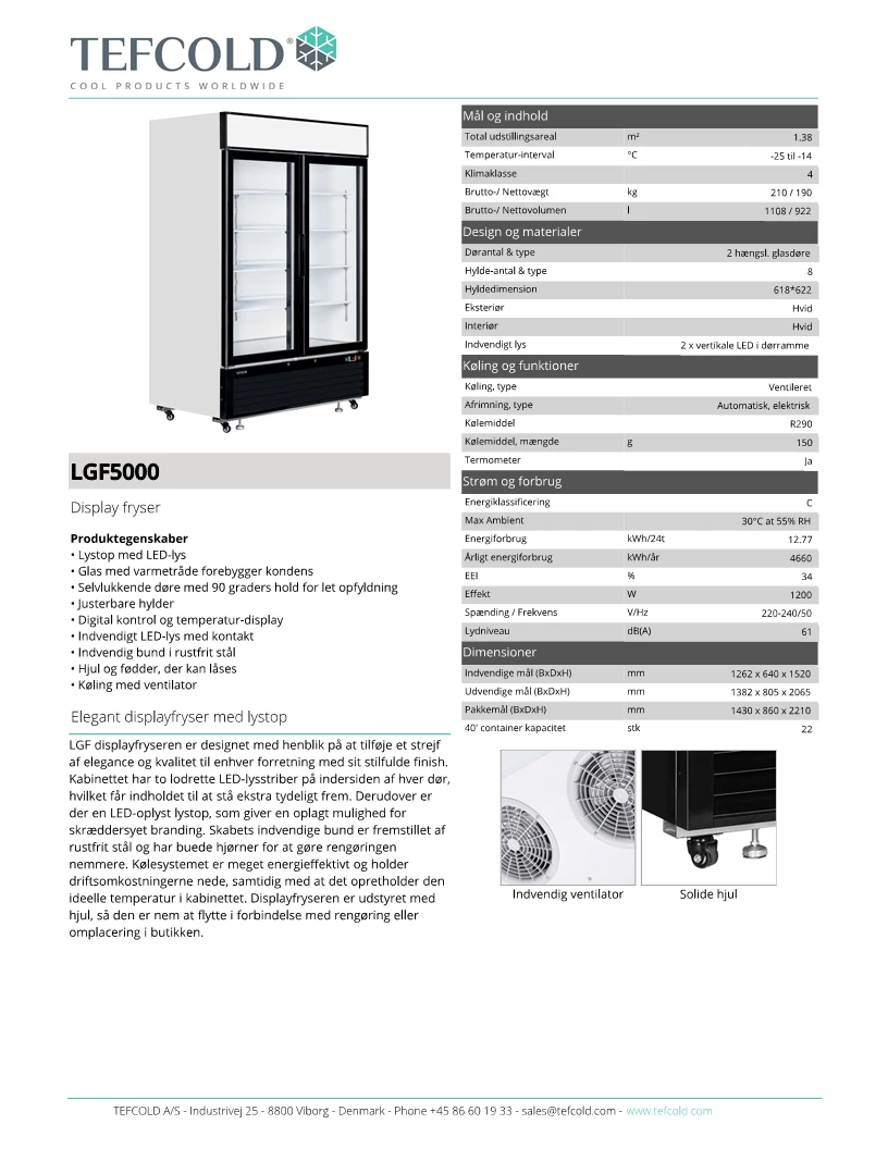• Lystop med LED-lys • Glas med varmetråde forebygger kondens • Selvlukkende døre med 90 graders hold for let opfyldning • Justerbare hylder • Digital kontrol og temperatur-display • Indvendigt LED-lys med kontakt • Indvendig bund i rustfrit stål • Hjul og fødder, der kan låses • Køling med ventilator El: 1200 W, 220-240 V, 50 Hz Udvendige mål: 1382 x 805 x 2065 mm Indvendige mål: 1262 x 640 x 1520 mm Temperaturinterval: -25 til -14 °C Brutto-/nettovolumen: 1108 / 922 l