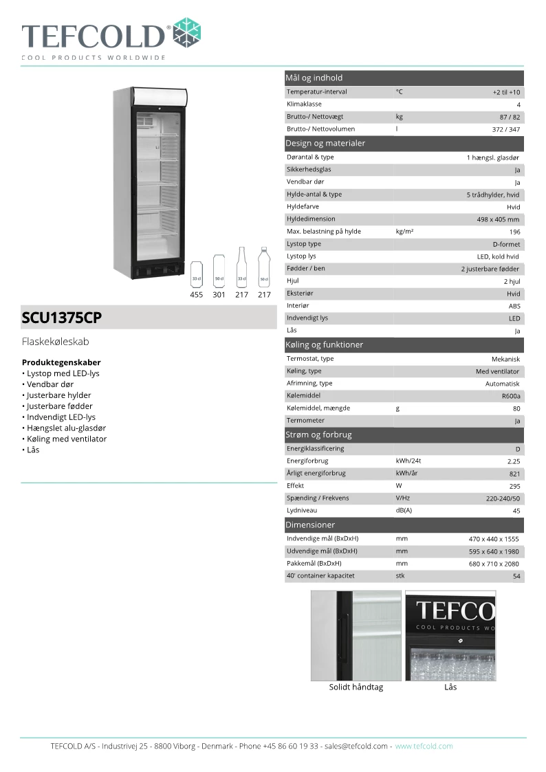 Kapacitet: 217 stk 33clflasker, Temperaturinterval: 2 til 10 °C, ventileret køl,