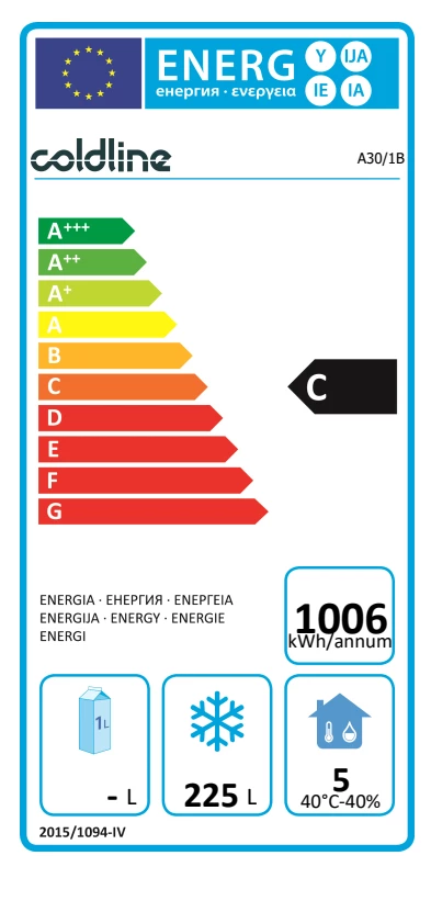 Rustfri stål. Højrehængt vendbar dør. Lås. Fodpedal. 3 rustfrie trådhylder 1/1 GN. Temperaturområde: -18/-22. Bruttoindhold: 334 ltr. Mål: B 535 x D 715 x H 2085 mm. El: 230 Volt. 50 Hz., 810 Watt. Energiforbrug pr. år 1006 kWh. Garanti: 1 år. Energimærke: C