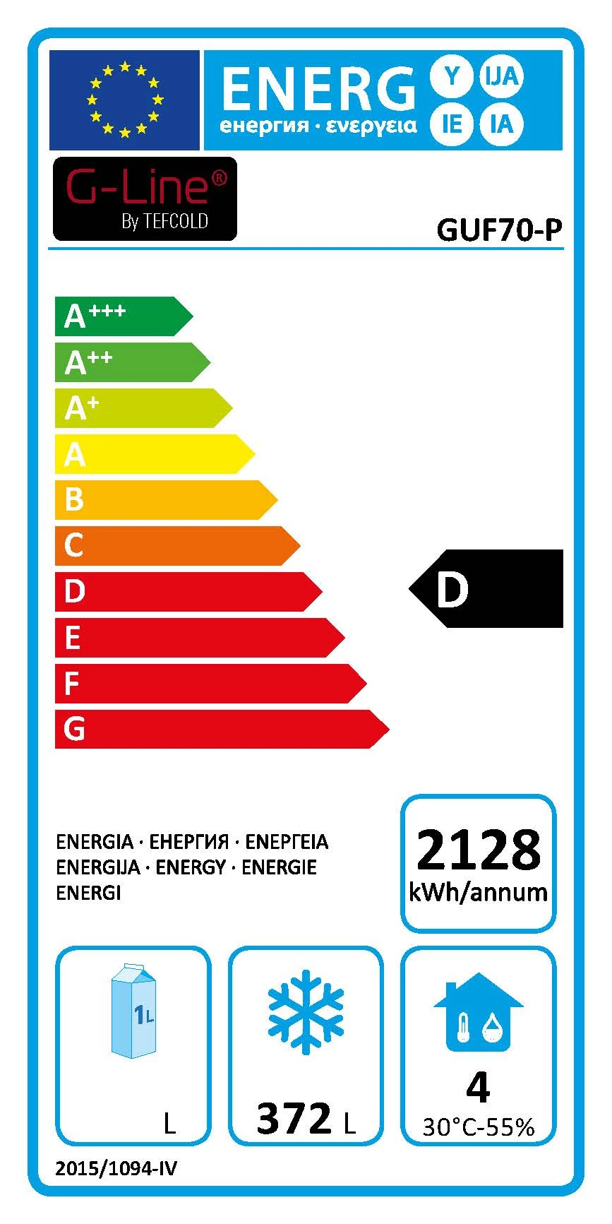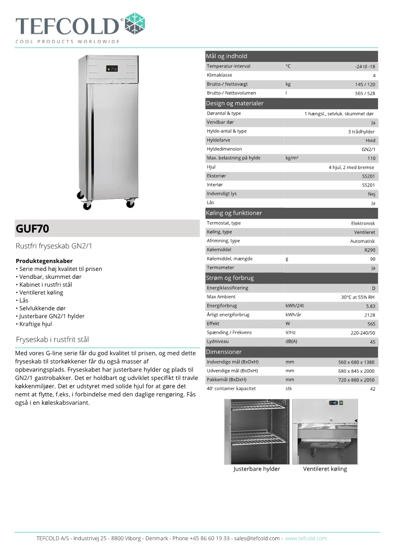 Rustfrit stål SS201 indvendig og udvendig Bruttoindhold 565 ltr. Temperaturområde: -24 til -18 °C Automatisk afrimning Ventileret køling Lås Vendbar selvlukkende dør 3 hvide trådhylder 2/1 GN. 4 hjul, 2 med bremse El: 230 Volt, 50 Hz, 565 Watt. Energiforbrug 5,83 kWh/24t Mål: B 680 x D 845 x H 2000 mm Lydniveau 45 dB(A) Vægt 120 Kg