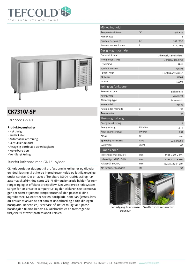 Rustfrit stål SS304 udvendigt, rustfri stål SS304 indvendigt. Temperaturinterval: -2 til 10 °C.