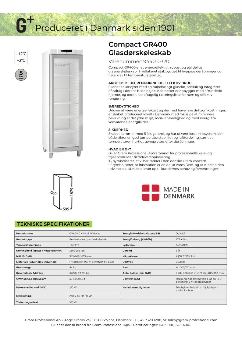 Hvidlakeret kabinet med glas dør. Hvid formstøbt PS plast indvendigt. Højrehængt glasdør med lås. Touchpanel med synlig alarm, panellås og temperatur regulering. Udvendigt termometer. Ventileret køling. Indvendig LED belysning. Hvide trådhylder. 4 stk 486x430 mm 1 stk 486x300 mm Temperaturområde +2/+12°C. Bruttoindhold: 356 ltr. Mål: B 595 x D 667 x H 1875-1905 mm. Ben 100-130 mm El: 230 Volt. 103 watt. Vægt 84 kg Energimærke: D Garanti: 5 år.