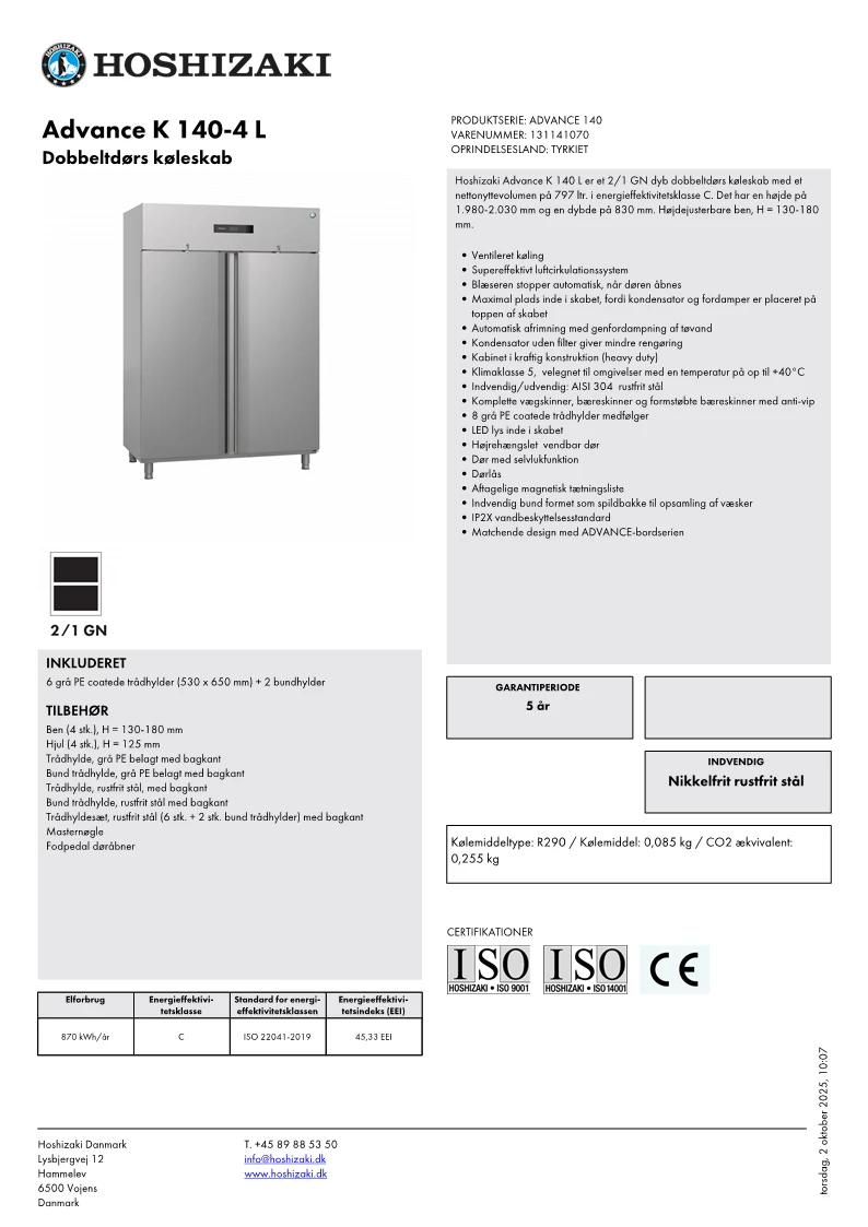 Udført i rustfrit stål. Dørlås. 8 plastbelagte trådhylder 2/1GN.