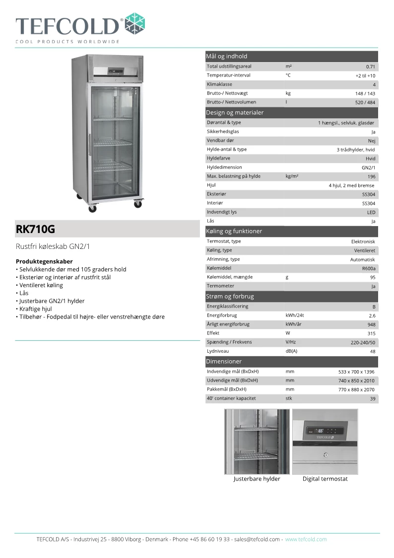LED-lys indvendigt. Temperaturinterval: -2 til 10°C, ventileret køl.