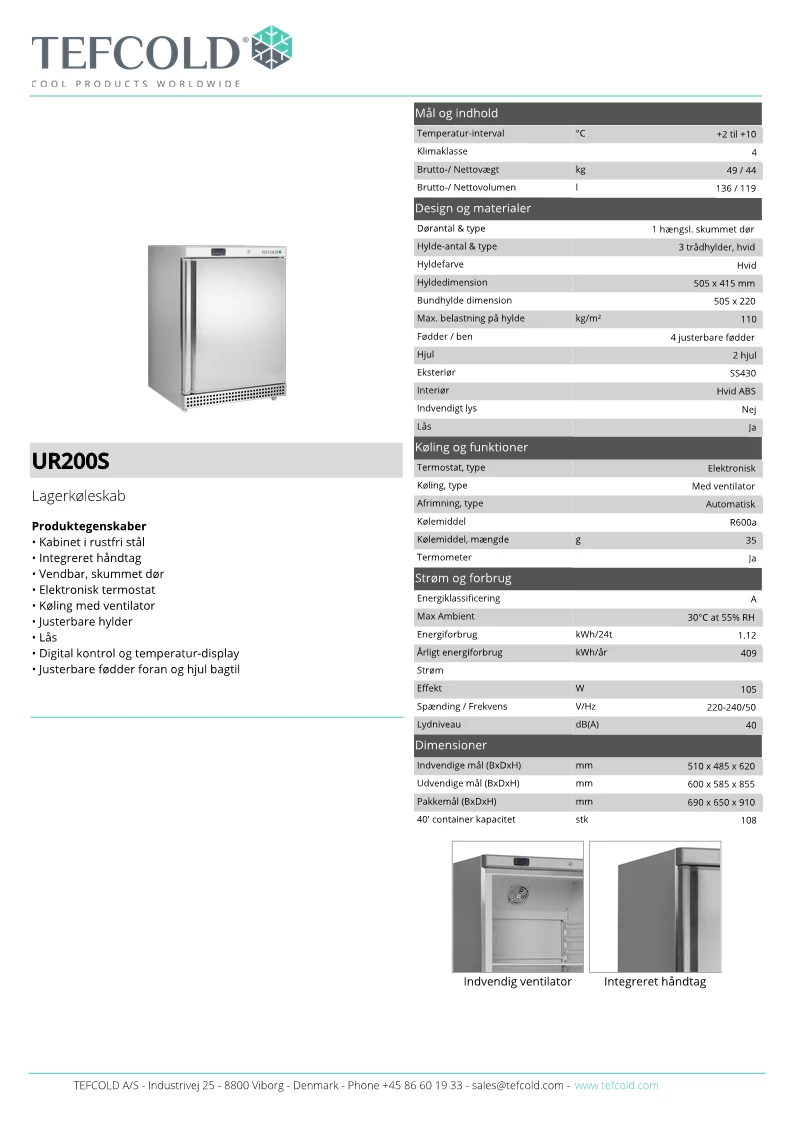 Bruttovolumen: 129-119 ltr Rustfrit kabinet, hvid ABS indvendigt, Temperaturinterval: 2 til 10 °C, ventileret køl. 4 justerbare fødder. 1 hængslet vendbar skummet dør. 3 trådhylder 503 x 415 mm - hvide. Spænding/Frekvens: 220-240/50 V/Hz, 70 Watt, Energiforbrug: 0,59 kWh/24/timer Energiklasse A+ BxDxH: 600 x 615 x 850 mm
