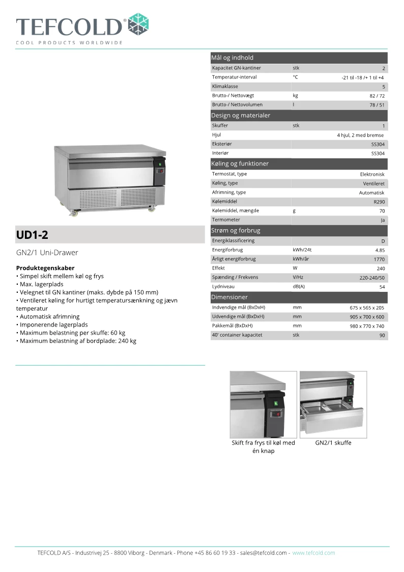 Simpel skift mellem køl og frys. Bruttovolumen: 78 ltr. Rustfrit stål SS304 udvendigt, rustfri stål SS304 indvendigt. Temperaturinterval: 1 til 4 °C,/ -21 til -18 °C, ventileret køl. Ventileret køling. 4 hjul - 2 med bremse 1 skuffe, 2/1 GN EL: 220-240/50 V/Hz, 270 Watt. Energiforbrug: 2,21 kWh/24/timer. Mål: BxDxH: 905 x 700 x 600 mm