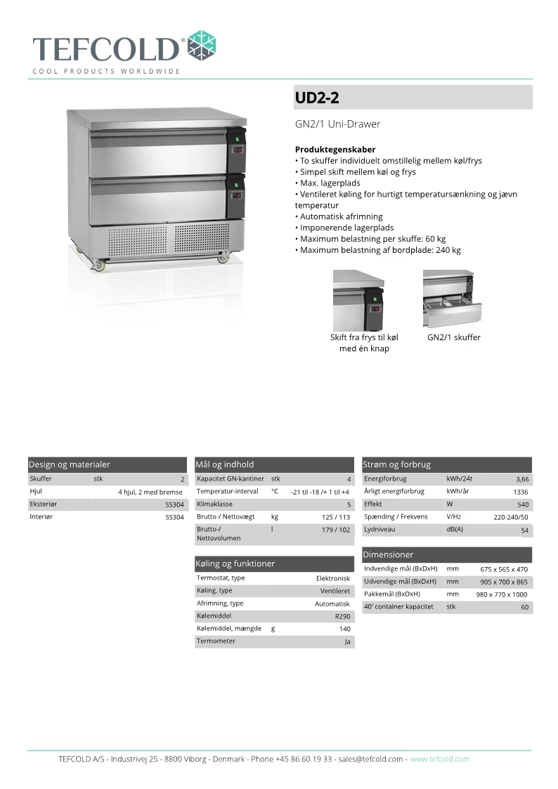 Simpel skift mellem køl og frys Bruttovolumen: 179 ltr. Rustfrit stål SS304 udvendigt, rustfri stål SS304 indvendigt. Temperaturinterval: 1 til 4 °C,/ -21 til -18 °C, ventileret køl. Ventileret køling. 4 hjul - 2 med bremse 2 skuffer, 2/1 GN i hver EL: 220-240/50 V/Hz, 540 Watt. Energiforbrug: 3,66 kWh/24/timer. Mål: BxDxH: 905 x 700 x 865 mm