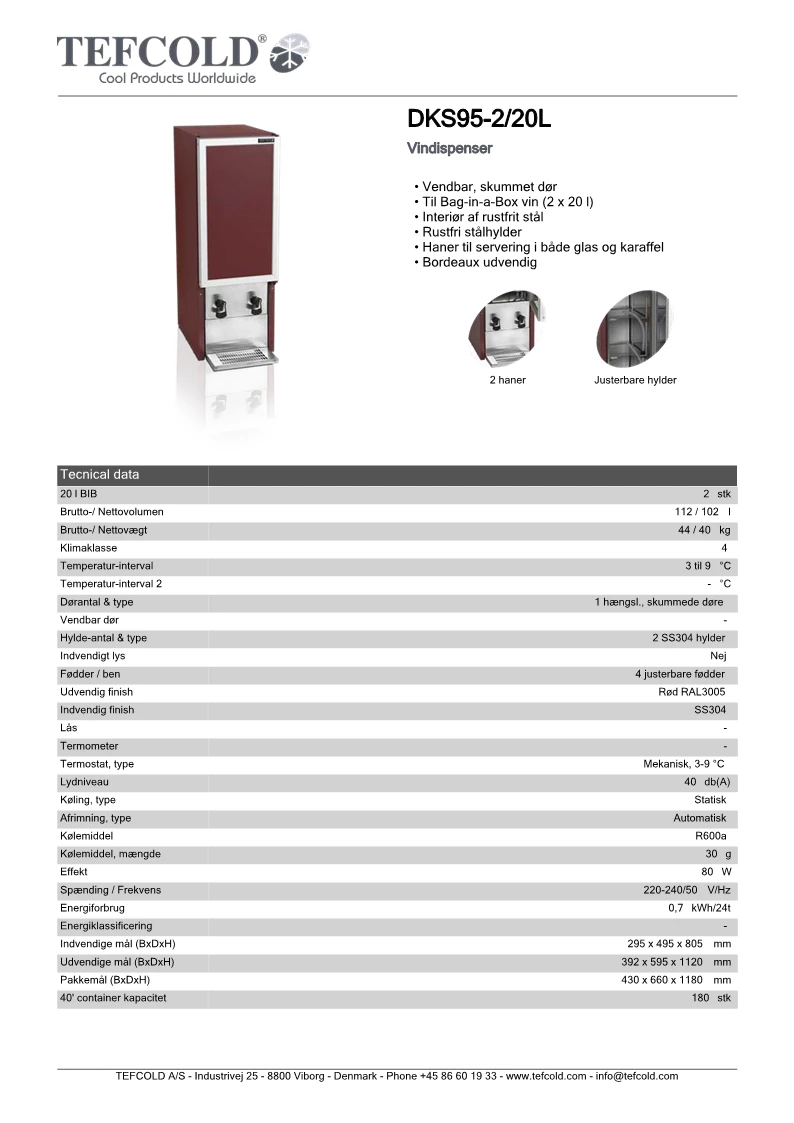Energiforbrug: 0,7 kWh/24/timer, BxDxH: 392 x 595 x 1120 mm