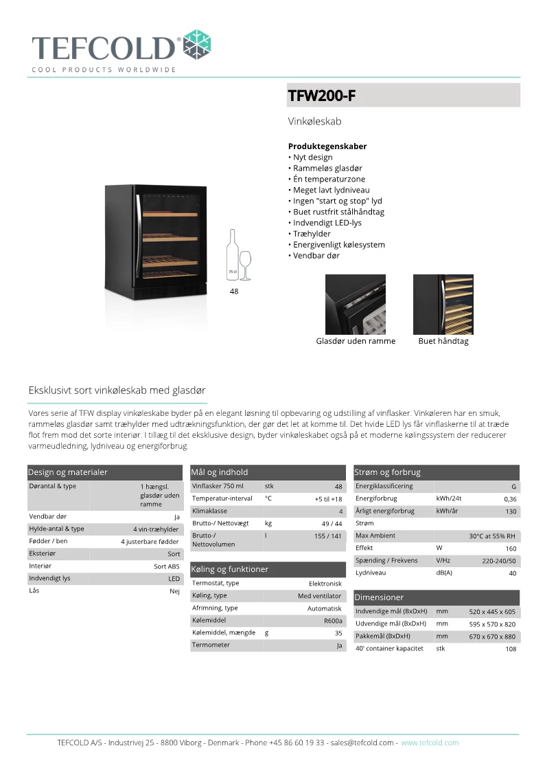 Bruttovolumen: 155 ltr, sort kabinet, sort ABS indvendigt, LED-lys indvendigt, Kapacitet: 48 stk 75cl vinflasker, Temperaturinterval: 5 til 18 °C, ventileret køl, 4 justerbare fødder, 1 hængslet vendbar, rammeløs glasdør med buet rustfrit stålhåndtag, 4 flytbare træhylder, Spænding/Frekvens: 220-240/50 V/Hz, 160 Watt, Energiforbrug: 0,36 kWh/24t Energiklasse G BxDxH: 595 x 570 x 820 mm