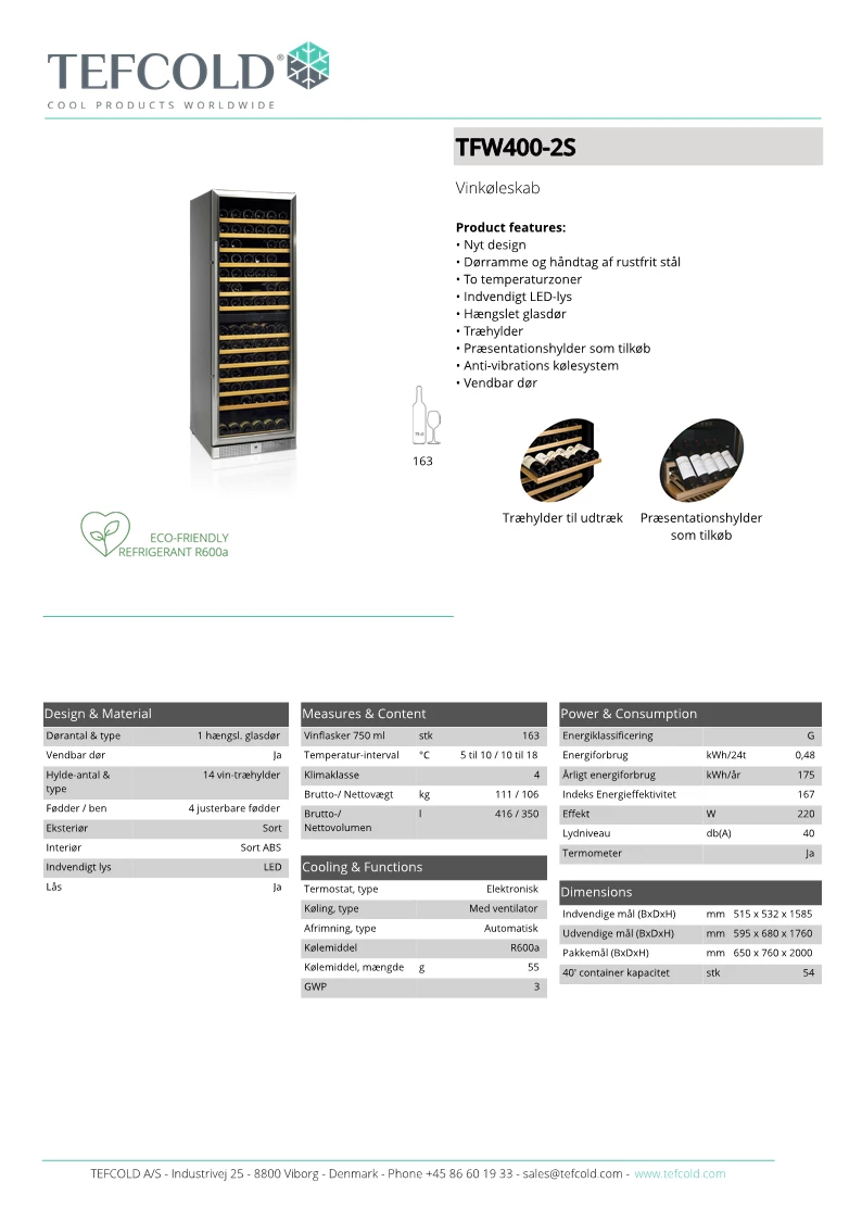 Bruttovolumen: 416 ltr, sort kabinet, sort ABS indvendigt, LED-lys indvendigt, Kapacitet: 163 stk 75cl vinflasker, To temperaturzoner Temperaturinterval: 5 til 10 °C / 10 til 18 °C, ventileret køl 4 justerbare fødder, 1 hængslet glasdør, Dørramme og håndtag i rustfrit stål 14 træhylder Spænding/Frekvens: 220-240/50 V/Hz, 220 Watt, Energiklasse: G Energiforbrug: 0,48 kWh/24/timer, BxDxH: 595 x 680 x 1760 mm