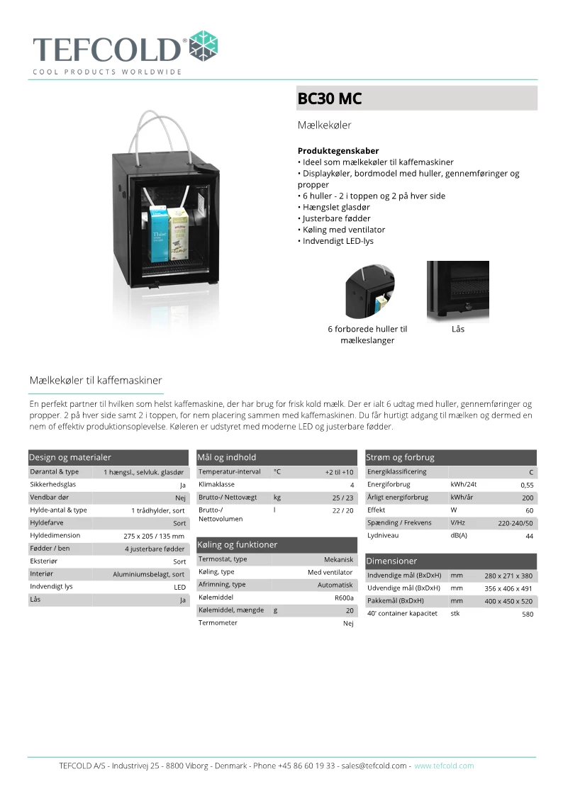 Mælkekøler til kaffemaskiner med udgange/indgange til slangeføring m. 6 huller - 2 i toppen og 2 på hver side. Bordmodel. 1 Hængslet selvlukkende glasdør 2 trådhylder, sort 4 Justerbarer fødder LED-lys indvendigt Aluminiumsbelagt sort Temperatur-interval: 2 til 10 °C, ventileret køl. Bruttovolumen: 22 ltr. Energiforbrug: 200 kWh/årligt, 0,55 kWh/24t Energiklasse C 60 W Spænding/Frekvens:220-240/50 Mål: BxDxH 356x406x491