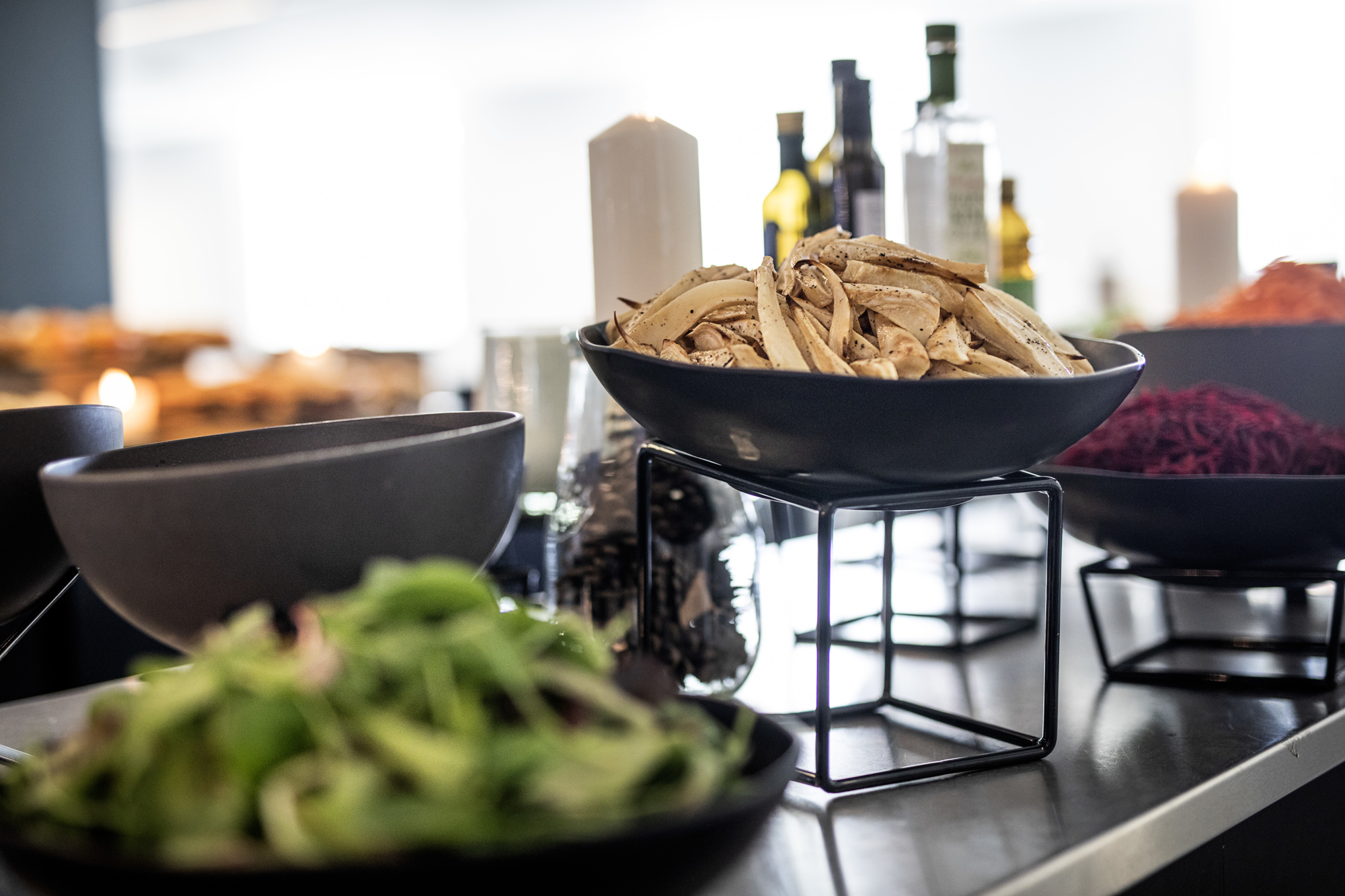 "Vi bruger alt, så vi undgår madspild, og vi kan servere kød, fordi det kun kræver 10-14 kilo, når vi portionsanretter. Og der er fremragende soyaprodukter, der både kan tilføre smagen af svampe og give struktur i en kødsovs. Vi fermenterer og eksperimenterer, så vi også kan opfylde specielle ønsker – som f.eks. når en af husets bornholmskfødte medarbejdere foreslår Gudhjems Dyppe til den næste omgang kogt torsk," fortæller køkkenchefen, som også er stolt af sin økologiprocent, der er på godt og vel sølvniveau.
