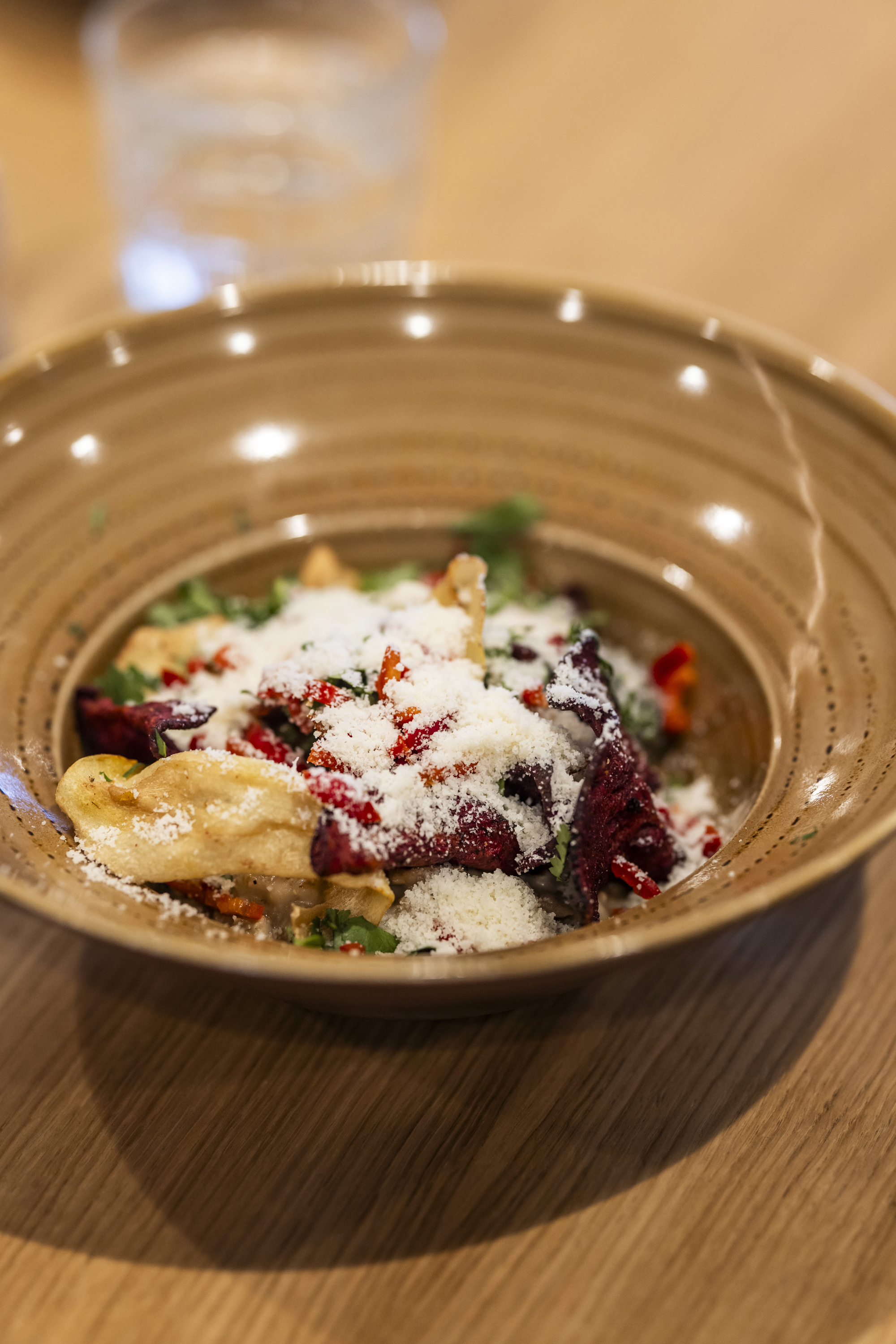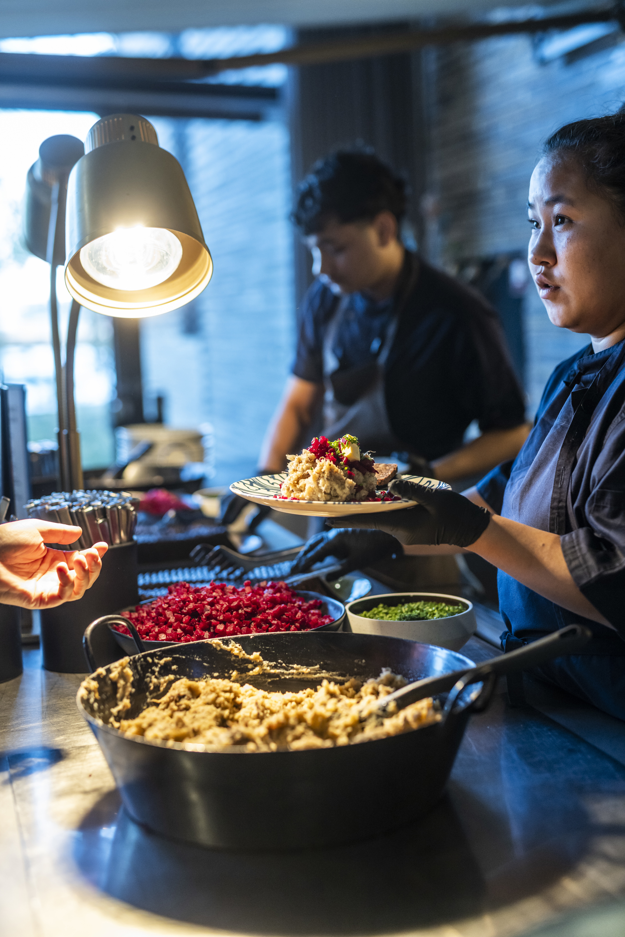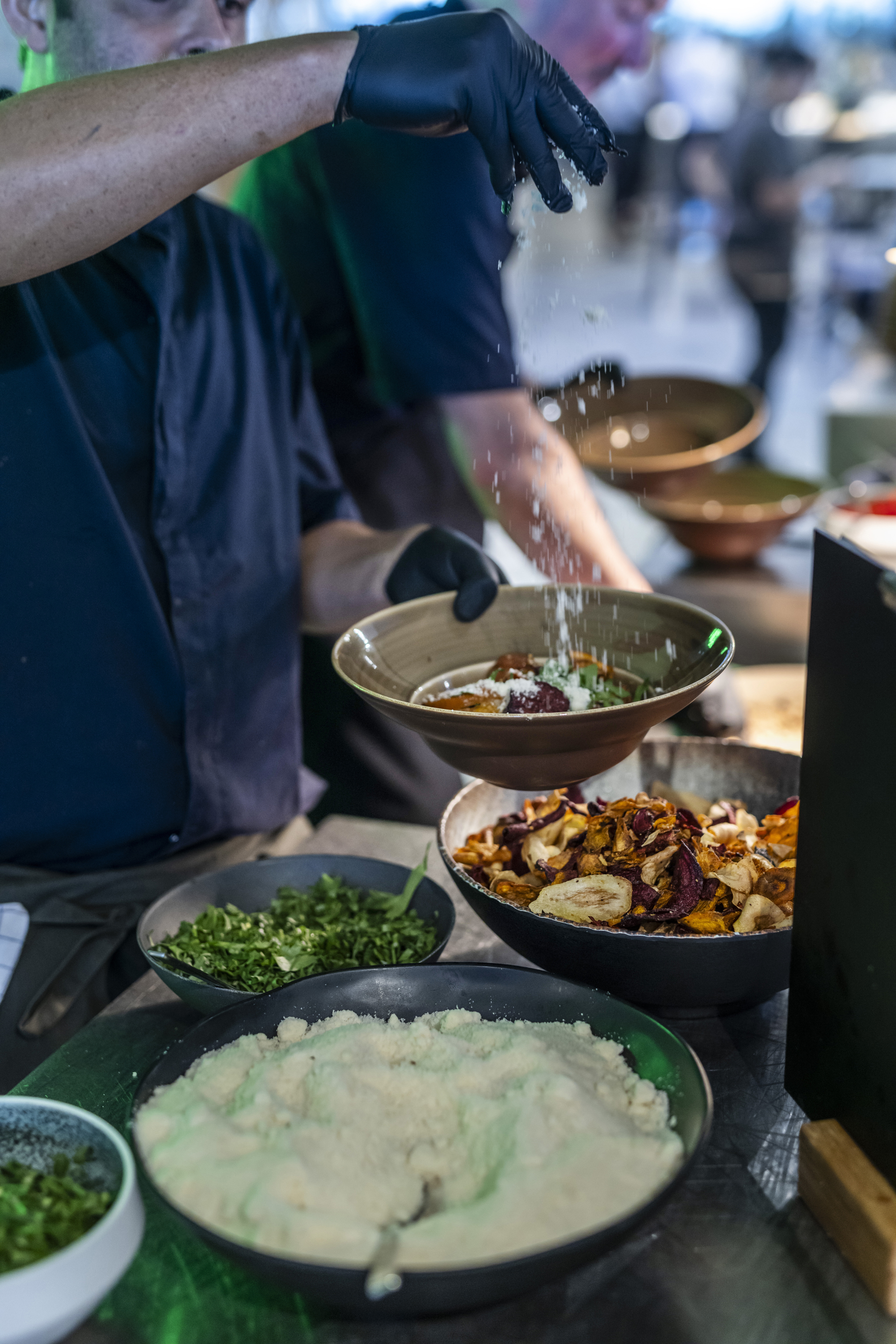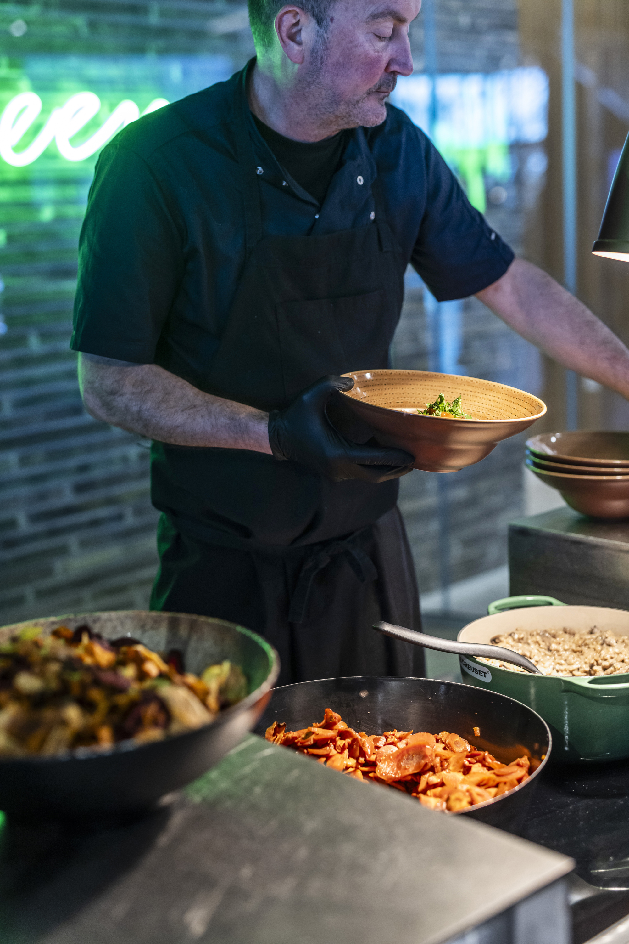 HOT GREEN er den første bod, gæsterne møder. Det er varme vegetariske og veganske retter, der er på menuen, og her får mange gæster også god inspiration til den grønne omstilling derhjemme. Der øses op fra varme gryder placeret forsænket i bordet i ergonomisk rigtig højde.
