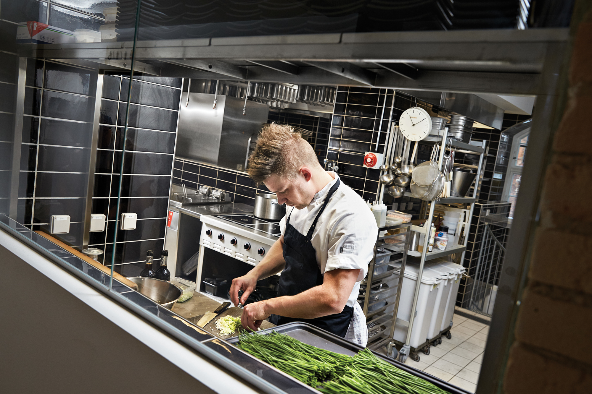 Allerede da kontrakten blev underskrevet i marts 2015 havde Jimmy Holm en idé om det nye, fire gange så store køkken. Med Kristian Brandt og Ole Mathiesen fra BENT BRANDT og en visionær arkitekt som sparringspartner for restaurantejeren blev det nok til 25 forskellige forslag til indretning, men i alle forslag var der én ting, der gik igen: En Josper ovn. "Jeg stiftede bekendtskab med Josper-ovnen på El Celler de Can Roca," fortæller Jimmy Holm. "Det er en trækulsfyret, lukket grill-ovn, der kan nå op på ekstreme varmegrader – vi har haft den på temperaturer over 550 grader. Ovnen har en helt unik varmekontrol, og ved at udsætte både kød, fisk og fjerkræ for de høje temperaturer i ganske kort tid, får man en helt unik, grillet smagsoplevelse. Og fordi ovnen er lukket, er forbruget af trækul begrænset." I opvasken er praktikken i højsædet. Både foran Hobart hætteopvaskemaskinen og Hobart grovopvaskeren er der indrettet skyllestationer, og for at sikre optimal glasopvask sker det i en Hobart underbordsmaskine, der er praktisk placeret i baren.