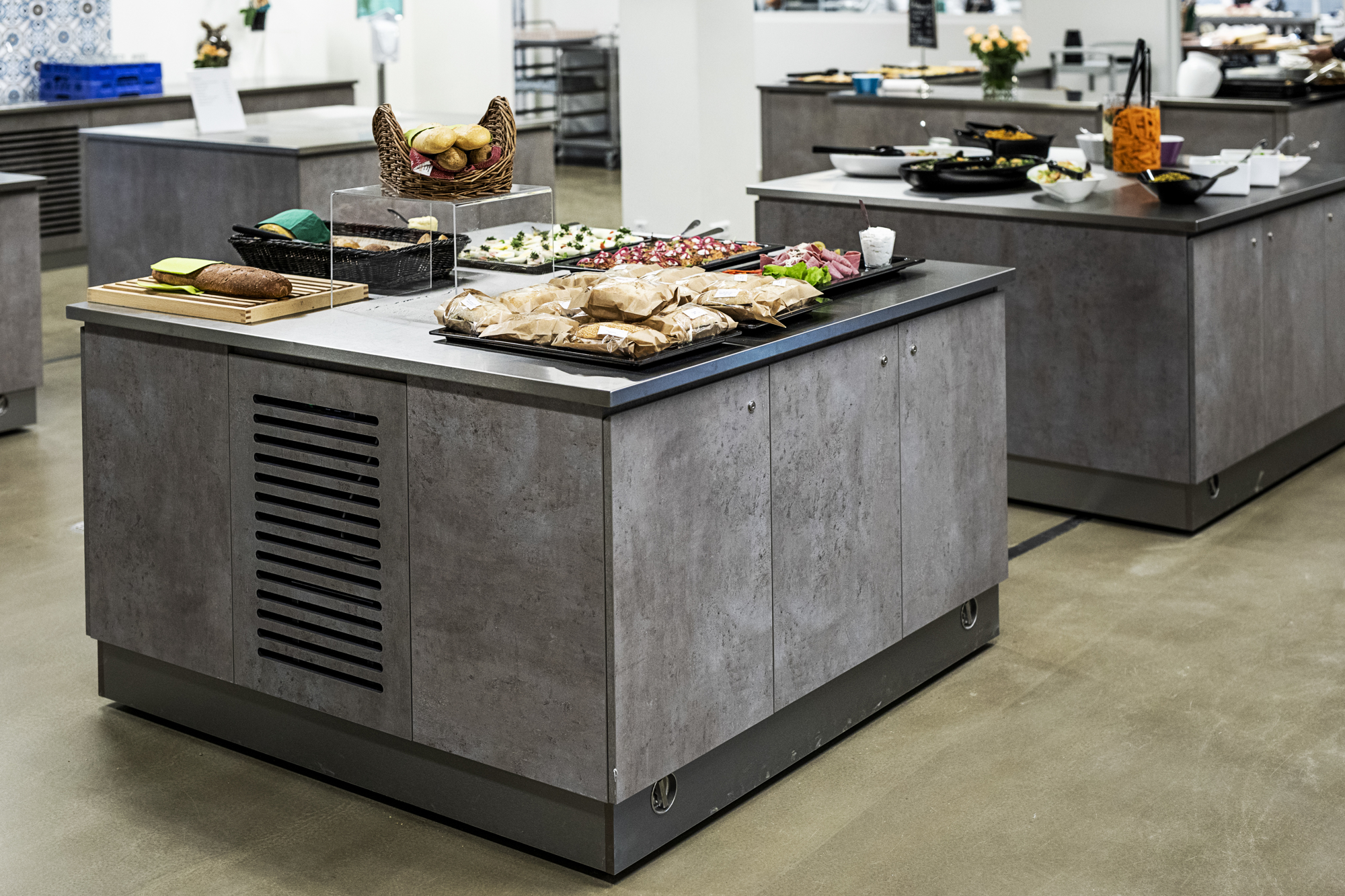 Alt andet er på hjul, så arbejdsdiskene med alt udstyr til f.eks. flambering, tranchering eller osteanretning kan flyttes rundt. Ja, for den sags skyld tages med ud af huset, for Torben Bastrup Nielsen har en drøm om, at College360 inviteres med til eksterne events og konkurrencer. Derfor råder skolen også over mobile ovne, induktionsøer, kølefaciliteter og flytbare borde og stole.